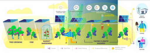 Například francouzská společnost Sun’Agri, která se zaměřuje na využití solárních panelů v zemědělství, vyvinula systém panelů, které dokáží podle potřeby změnit polohu a panely tak fungují jako žaluzie. Ve vodorovné poloze dokáží rostliny ochránit proti přímému slunci nebo třeba krupobití. Naopak ve svislé poloze může k rostlinám víc slunce. Správnou polohu panelů řídí umělá inteligence.