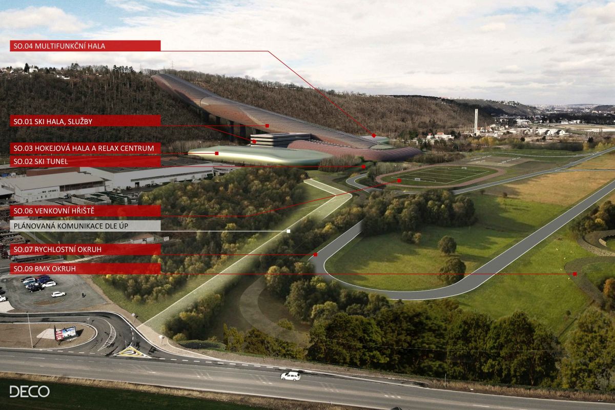 Kromě toho areál obsáhne uzavřený okruh pro cyklokros nebo BMX, rychlostní in-line okruh, vnitřní halu s tenisovými, squashovými a badmintonovými kurty nebo plavecký bazén s wellness. Jedná se o stavbu za pět miliard korun a celou ji zaplatí investoři. Za projektem stojí Skupina Deco, která se zaměřuje na projekční práce a stavitelství, stavební firma Strabag a technologickou část řeší Instalace Praha a TechnoAlpin.