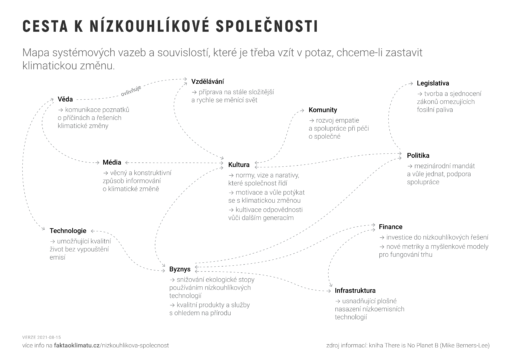 Podobně lze s pomocí této mapy komplexněji přemýšlet také o klimatické změně – co všechno znamená tato změna pro současnou společnost? A chceme-li dospět k nízkouhlíkové budoucnosti, což je pro zastavení globálního oteplování nutné, jaký dopad budou mít jednotlivé změny na místní komunity, na svět byznysu, na systém vzdělávání? Jakou infrastrukturu k tomu potřebujeme a jak se musí změnit zákony?