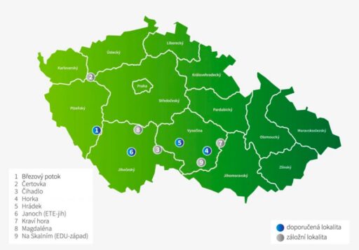 Stát bude vybírat ze čtyř doporučených lokalit, které jsou na mapě vyznačeny modře. Zdroj: SŮRAO