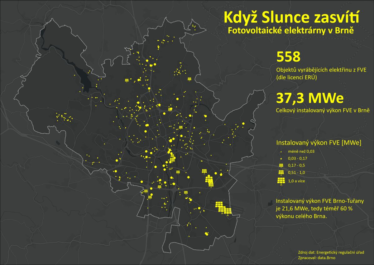 V Energetické koncepci Brna z roku 2016 se můžeme například dočíst, že instalovaný výkon fotovoltaických elektráren v Brně v té době dosahoval 33 megawattů (MWe). V témže roce začala platit novela energetického zákona, která umožnila provozovat výrobnu elektřiny připojenou k elektrizační soustavě do instalovaného výkonu deset kilowattů bez licence. Díky tomu se dá předpokládat, že počet nejmenších zdrojů výrazně narostl.