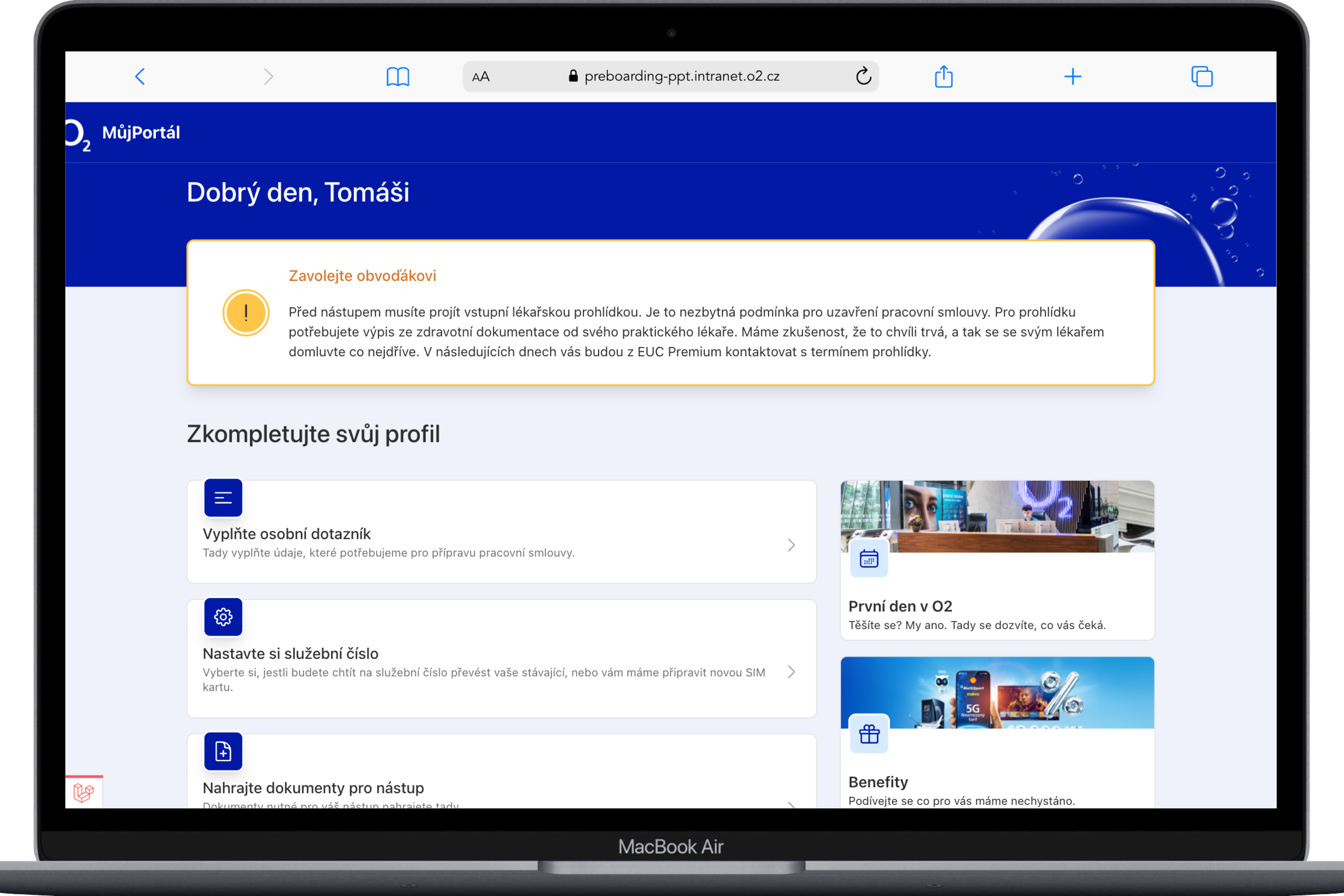 Je přehledná a dostupná. Zaměstnanec, který nastupuje do O2, vyřídí vše potřebné v klidu a z pohodlí domova. Buď ze svého telefonu nebo z počítače. Vše má pak přístupné kdykoliv a kdekoliv přehledně na jednom místě.
