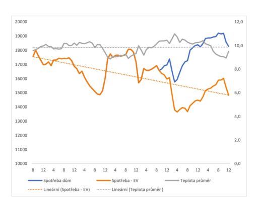 První zajímavý poznatek je, že se v našem domě podařilo spotřebu elektřiny podstatně snížit (postupným zateplením vnějších stěn a částečnou náhradou vytápění přímotopy splitovými jednotkami – tepelnými čerpadly vzduch – vzduch). Graf ukazuje trendovou linii spotřeby, očištěnou o odhad spotřeby použité na nabíjení elektroauta. Nezdá se přitom, že jde o vliv změny teploty, jak dokládá graf průměrné teploty. Všechna data jsou na bázi rolujících se dvanácti měsíců (naopak, teplejší léta o něco zvýšila spotřebu díky vyššímu užití klimatizace – jakkoliv jednotky používáme hlavně na topení).
