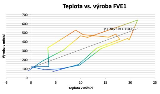 Závislost lze vyjádřit i na teplotě, ačkoliv je vidět, že vývoj v různých letech se liší. Teplé měsíce jsou zároveň těmi slunečnými. Lineární závislost je překvapivě výrazná.