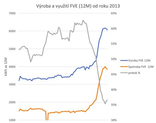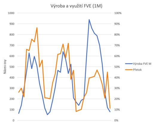 Kompletní data o dvanácti měsíční výrobě a využití elektřiny (podílu přetoků) obsahuje tento graf.