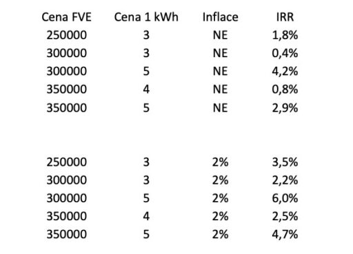 Pro modelový propočet jsem zvolil ceny FVE 250, 300 a 350 tisíc (nejvyšší odpovídá „optimistické ceně“, ke které by se mohla přiblížit FVE potřebného výkonu, lépe umístěná než naše, dnes bez dotace), startovací ceny elektřiny 3, 4 a 5 korun za kWh, s tím, že dále roste bez inflace nebo s inflací (dvě procenta) a při zachování minimální platby za přetoky. A z toho pak jsem spočítal vnitřní výnosové procento (IRR) různých variant.