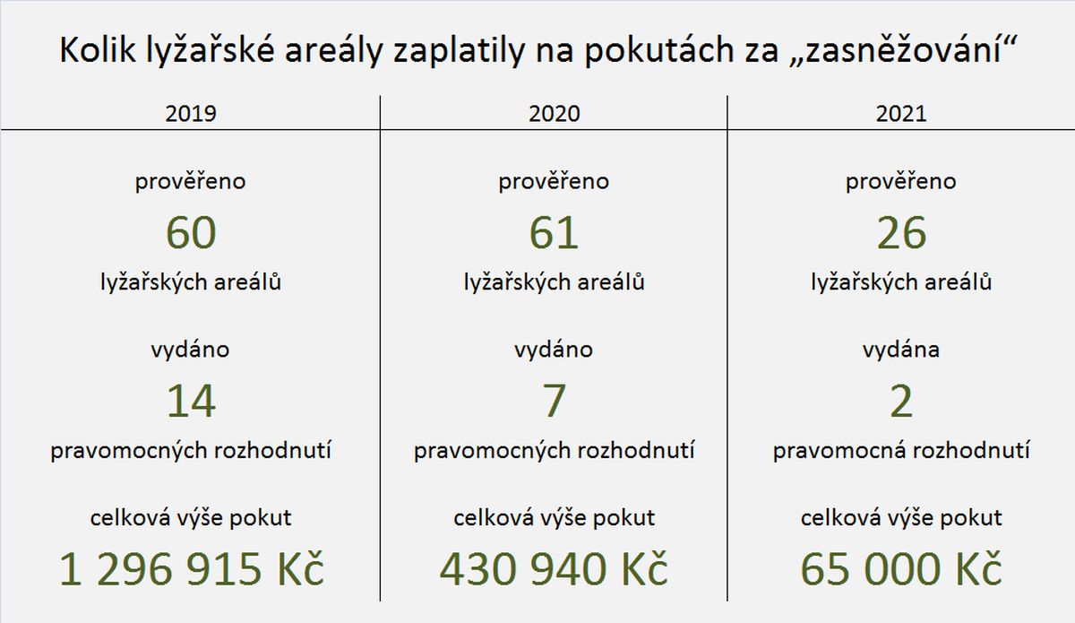 Ze statistik inspekce vyplývá, že za poslední tři roky byla uložena nejvyšší pravomocná pokuta společnosti SKI Bílá – Služby, a to ve výši 517 800 korun, převážně za nedovolený odběr povrchových vod za účelem výroby technického sněhu.