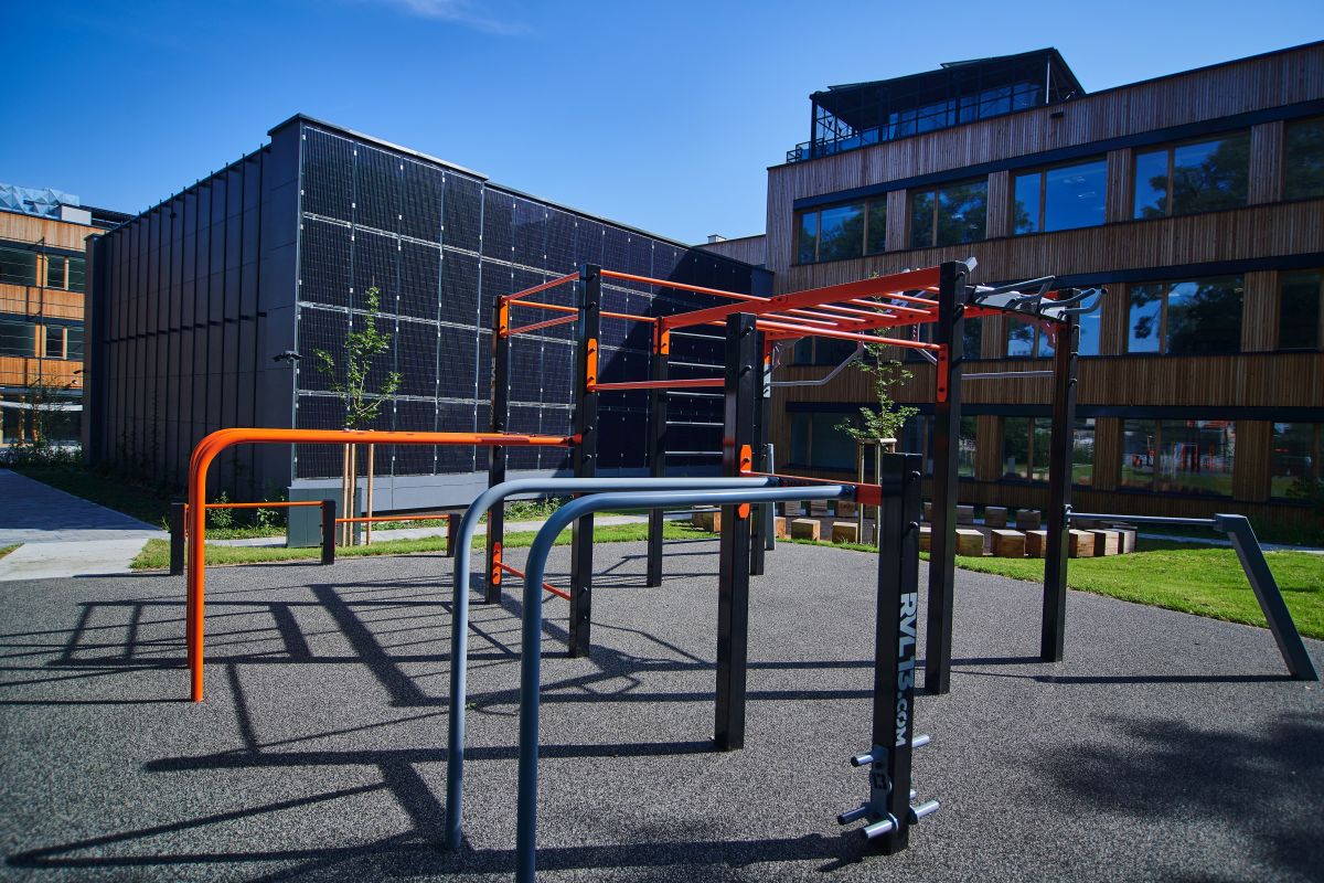 Ze všech oken se žáci dívají do zeleně a mimo výuku mohou relaxovat na venkovním hřišti, u ping-pongu, na lavičkách či v kavárně s venkovním posezením.