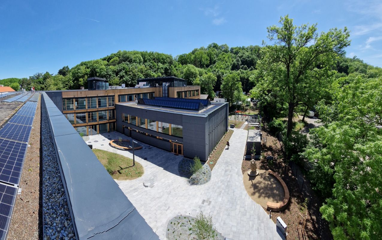 Na příznivém klimatu školy se kromě technologií podílí zeleň. Zahrada na střeše pomáhá zadržovat dešťovou vodu a popínavé rostliny, které se časem vyšplhají po připravených ocelových lankách na fasádě, budou přirozeně stínit budovu a chladit ji.