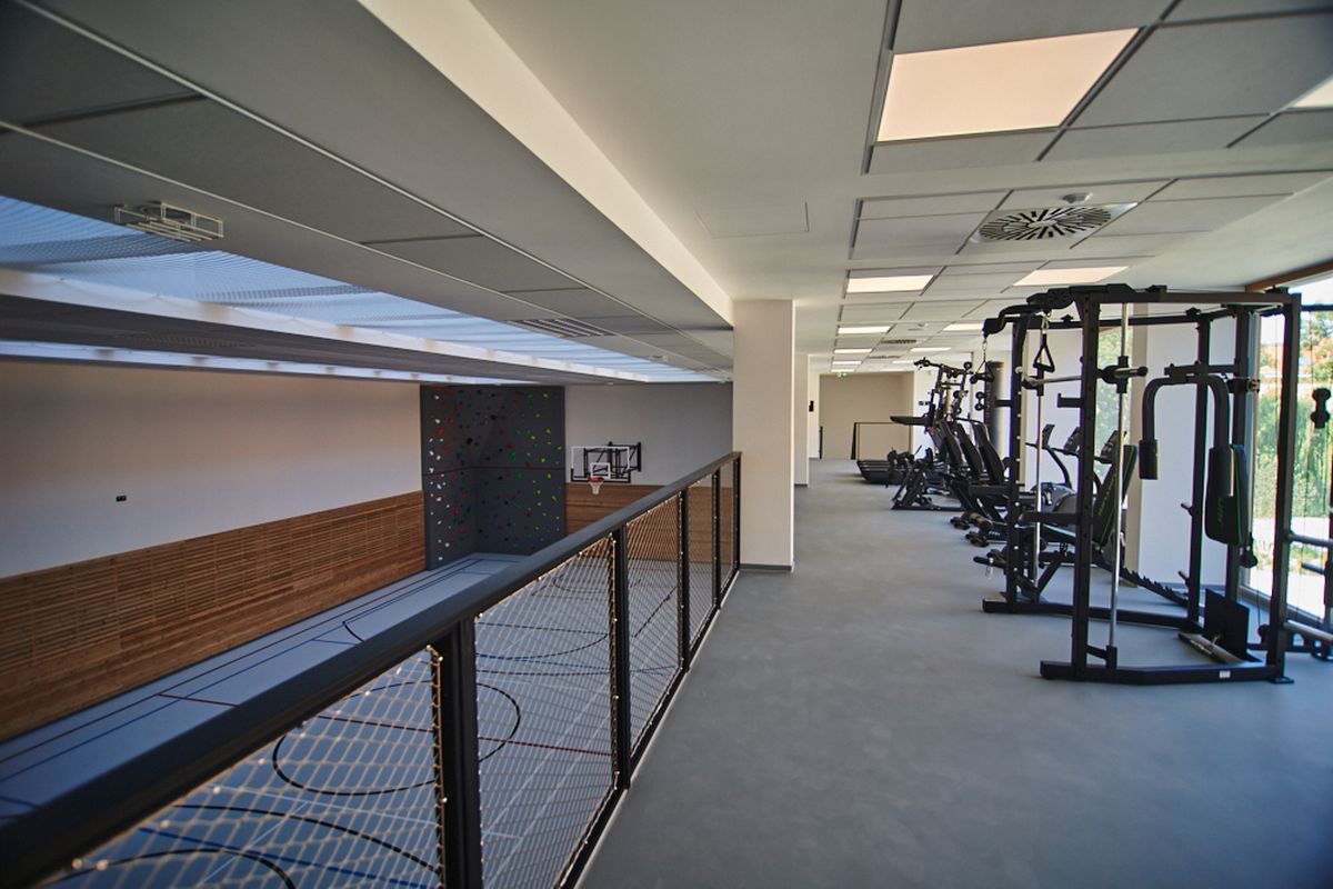 Zděná tělocvična přistavěná v devadesátých letech měla původně okna na jih. „Umíte si představit, jak příjemné bylo v ní za slunečných dní sportovat,“ poznamenává Tencar. Dnes jižní fasádu pokrývají sluneční panely a světlo dovnitř vstupuje skrze střešní světlík a přes prosklenou posilovnu v prvním patře tělocvičny.
