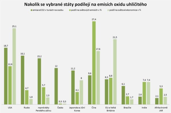 Hlavním producentem emisí na osobu jsou nadále Spojené státy, zatímco státy s největším podílem světové populace, jako je například Indie, produkují zhruba devětkrát méně emisí na osobu.