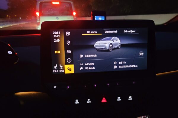 Těsně před domovem jsem odečetl výsledek 645 km, průměr 96 km/h (dáno omezení, jízdou mimo dálnici a blouděním k první nabíječce) se spotřebou dle auta (v obrovském vedru a klimatizaci na 22 stupňů) 16,5 kWh/100 km.