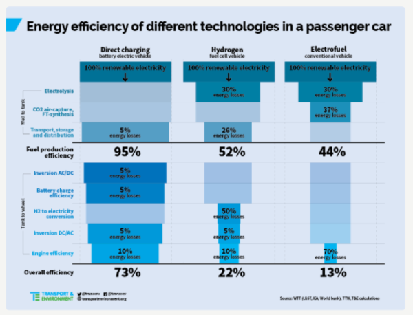 Propočty ukazují, že zatímco bateriová auta jsou schopna využít přes sedmdesát procent čerpané elektřiny na pohyb, u elektromobilů s palivovým článkem jde jen o něco málo přes pětinu elektřiny využité na výrobu paliva a k pohonu spalovacího auta pomocí syntetického paliva se využije ani ne šestina energie. Koresponduje to s dnešními odhady, že na výrobu jednoho litru syntetického paliva je třeba přes 25 kWh elektřiny (data společnosti Shell), zatímco za stejné množství elektřiny ujede bateriový elektromobil obvykle přes sto kilometrů.