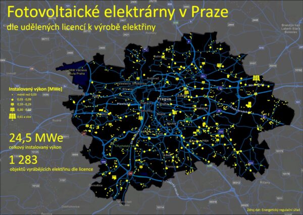 Na území hlavního města Prahy se nachází necelých třináct set fotovoltaických elektráren, od těch nejmenších na střechách po velké zdroje na okrajích města. Jejich celkový výkon dosahuje 24,5 megawattu, což je o třetinu méně než v Brně.