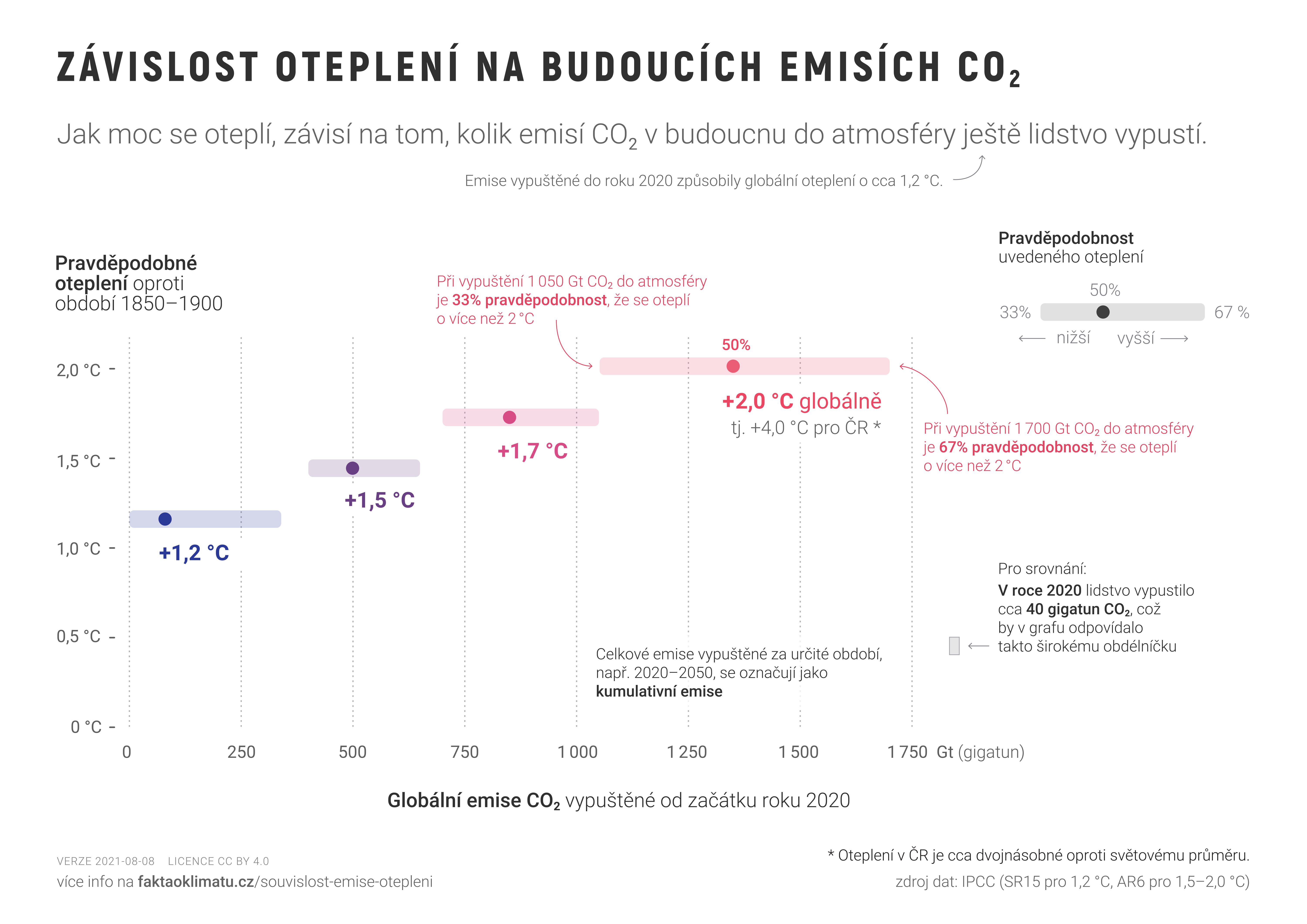 - Infografika Závislost oteplení na budoucích emisí CO2: výroba, spotřeba, emise od autora Fakta o klimatu, licencováno pod CC BY 4.0.