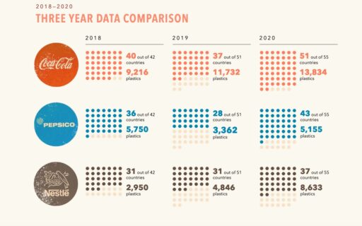 Logo Coca Coly dobrovolníci našli na 13 834 kusech plastů na plážích, v řekách a v parcích. Plastů s logem Pepsi bylo 5155 kusů, se značkou Nestlé pak 8633. Tito nadnárodní obři patří ale zároveň k největším výrobcům potravin na světě.