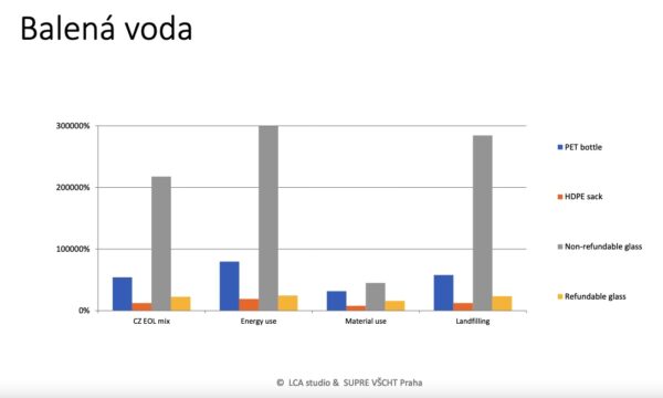 Smysl podle Kočího dává, pokud se výrobek podílí na celkovém dopadu ze zhruba osmdesáti procent a obal ze zbývajících dvaceti. Ne vždy tomu tak ale je. „Například u balené vody představuje několikanásobně větší zátěž PET než samotná voda,“ uvádí Kočí. U vody přitom všechny měřené obaly vycházejí hůře než dopad samotného výrobku, přičemž rozdíly jsou ve stovkách tisíc procent. Nejlépe z tohoto pohledu funguje vratné sklo.