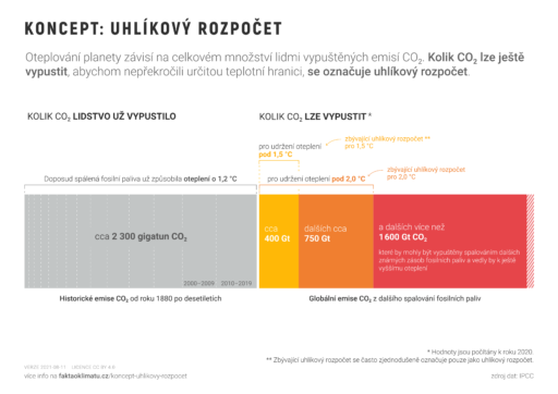 Do souvislostí dává uhlíkový rozpočet zpráva a grafika webu Fakta o klimatu. Podle jejich analýzy a dat činí historické emise od roku 1880 zhruba 2300 gigatun CO2. Kvůli tomu došlo za uvedenou dobu k oteplení planety o 1,2 °C, z čehož je jasné, že prostor do zmíněného limitu 1,5 stupně není příliš velký.