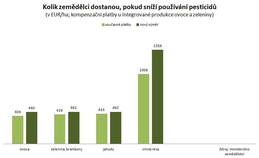 Pokud zemědělci budou hospodařit šetrněji vůči přírodě, dostanou vyšší dotace, respektive štědřejší kompenzační platby. U ovoce si například pěstitelé polepší o čtrnáct procent na hektar, u zeleniny o osm procent. Vinaře čeká největší přilepšení, pokud přejdou na takzvané zelené hnojení a úplně upustí od používání herbicidů (v grafu níže jde o sečtené kompenzační platby na různé účely, pozn. aut.)