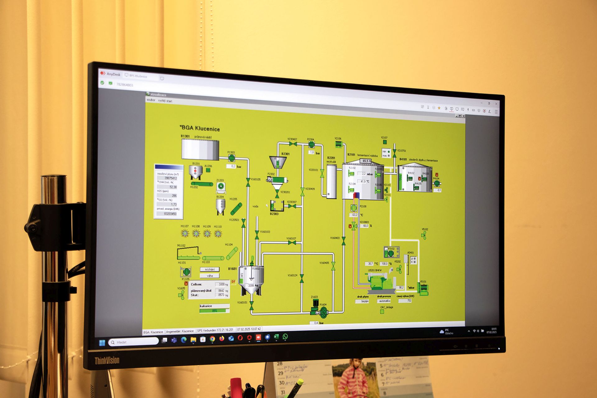 Správci stanice mě berou po schůdkách nahoru k okénku, ze kterého je vidět dovnitř. „Když se podíváte, uvidíte bublinky bioplynu,“ říká mi Ondřej Vopička. Bioplyn se uvolňuje díky působení bakterií. Jde vlastně o řízené kvašení neboli fermentaci. Jako vedlejší produkt vzniká digestát, který se dá použít jako hnojivo.