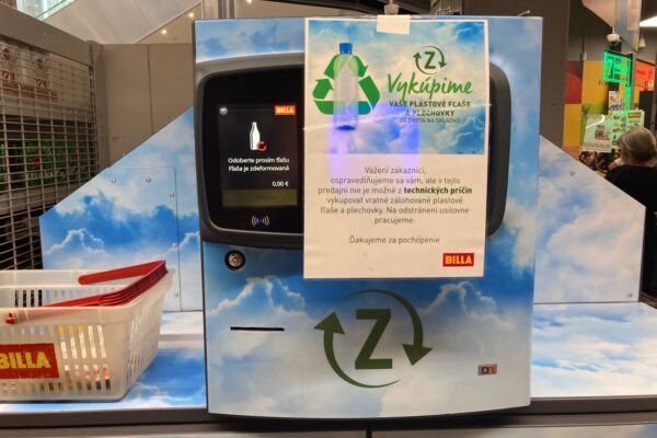 Nechávám paní, se kterou jsem se dosud bavila, vrátit všechny skleněné flašky a jdu hledat „zálohomat”. Není to vůbec těžké, naproti regálům s alkoholem stojí obrovská zelená krabice. Na stroji je ale přilepen papír s nemilosrdným nápisem „Mimo provoz”. Jdu dál, tady už nic o zálohovaných lahvích nezjistím.